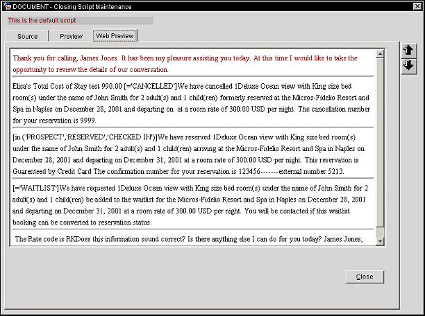The Preview tab allows a preview of the script prior to deploying it to the properties. Preview the appearance of your closing script as it would display from the Reservation screen or the Cross Reservations screen in a Thick Client environment.