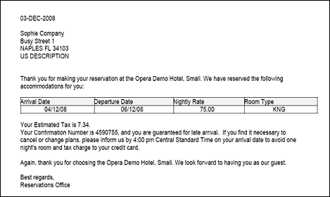 OPERA allows you to fax, email or print letters for the individual guest and/or to the company, agent, source, or group who made, updated, or canceled the reservation. Sending confirmation letters can be integrated into the booking process, or handled afterward from the Reservation screen Options menu. Confirmation letters can also be sent to Waitlisted Reservations when the application setting is active: Property > Function > Reservation > Waitlist = Y.