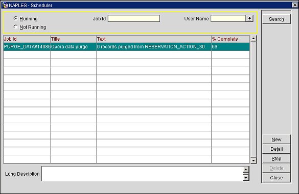 Running. Select this option button to view the jobs that are currently in queue and are processing. The Running Scheduler screen appears. This is the default screen when the OPERA Scheduler is first accessed.