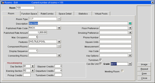 Note: Section and Credits fields do not display for rooms that are assigned to Component Room room types. These features are applied at the level of the individual rooms that comprise the component room.